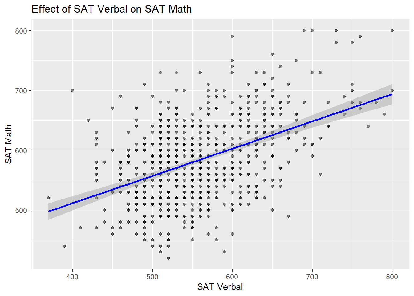 ggplot(admissions_clean, aes(x = SAT_verbal, y = SAT_math)) +geom_point(alpha =0.5) +geom_smooth(method ="lm", col ="blue") +labs(title ="Effect of SAT Verbal on SAT Math", x ="SAT Verbal", y ="SAT Math")