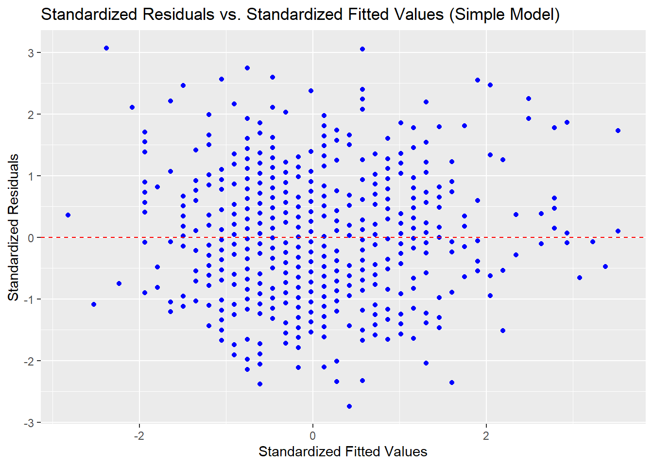 ggplot(admissions_clean, aes(x = std_fitted_simple, y = std_residuals_simple)) +geom_point(color ="blue") +geom_hline(yintercept =0, linetype ="dashed", color ="red") +labs(title ="Standardized Residuals vs. Standardized Fitted Values (Simple Model)",x ="Standardized Fitted Values", y ="Standardized Residuals")