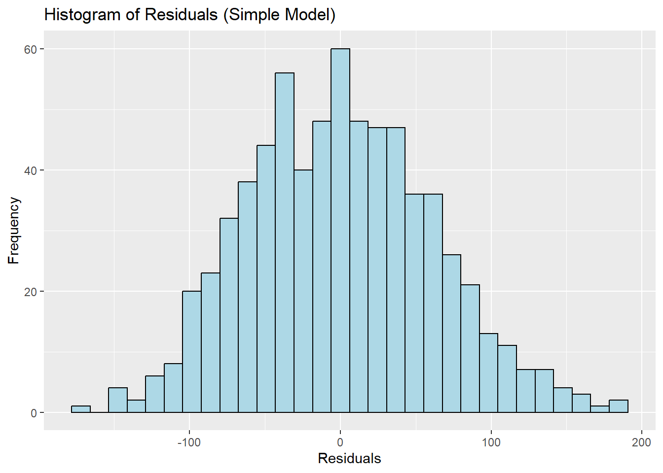 ggplot(admissions_clean, aes(x = residuals_simple)) +geom_histogram(bins =30, fill ="lightblue", color ="black") +labs(title ="Histogram of Residuals (Simple Model)", x ="Residuals", y ="Frequency")