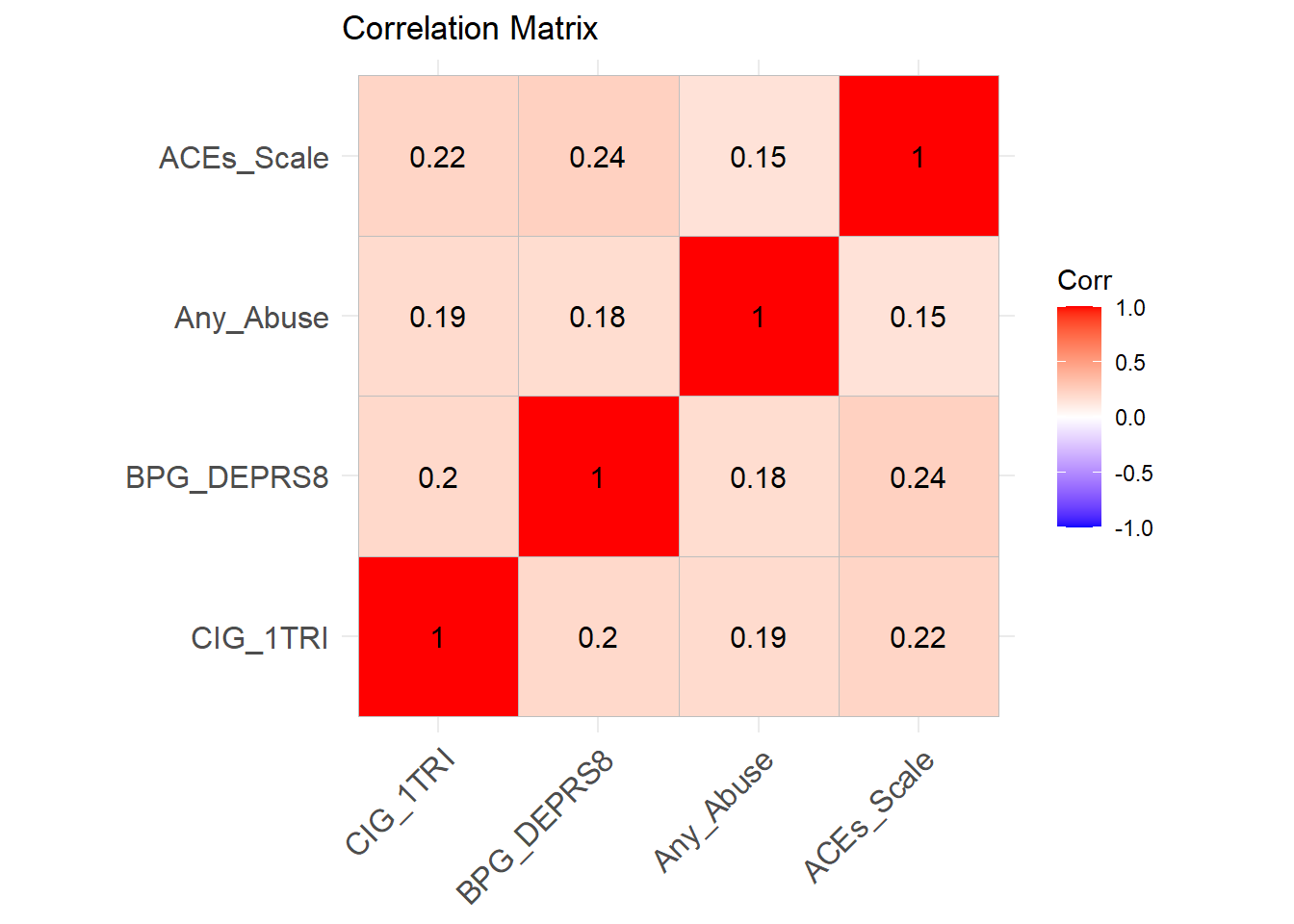 cor_matrix <- cor(data %>% dplyr::select(CIG_1TRI, BPG_DEPRS8, Any_Abuse, ACEs_Scale), use = "complete.obs", method = "spearman")