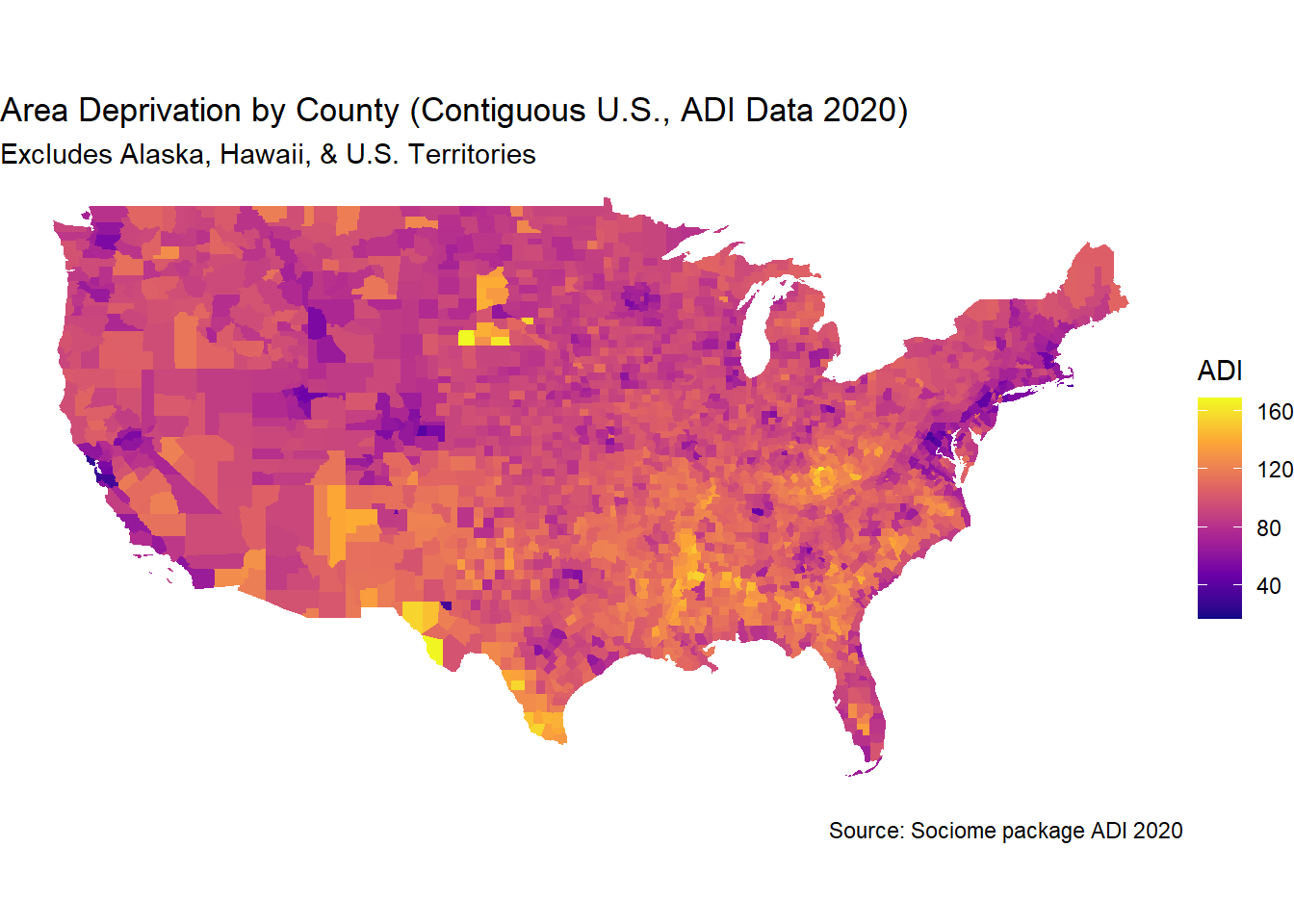 library(ggplot2)ggplot(adi_map_data) +geom_sf(aes(fill = ADI), color =NA) +scale_fill_viridis_c(option ="plasma", name ="ADI") +labs(title ="Area Deprivation by County (Contiguous U.S., ADI Data 2020)",subtitle ="Excludes Alaska, Hawaii, & U.S. Territories",caption ="Source: Sociome package ADI 2020" ) +theme_void()